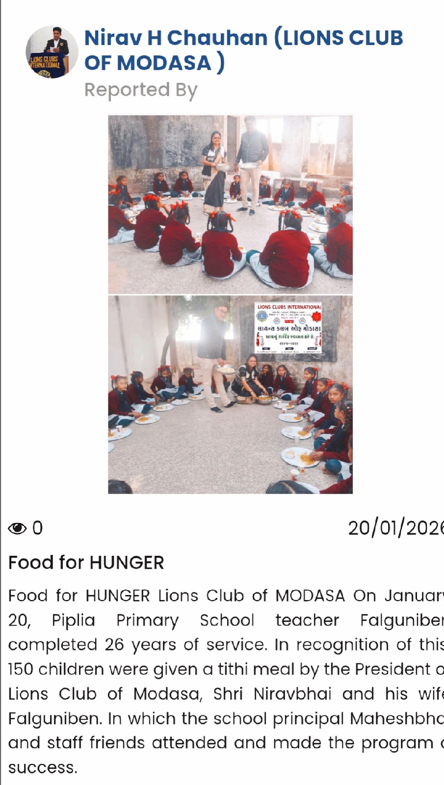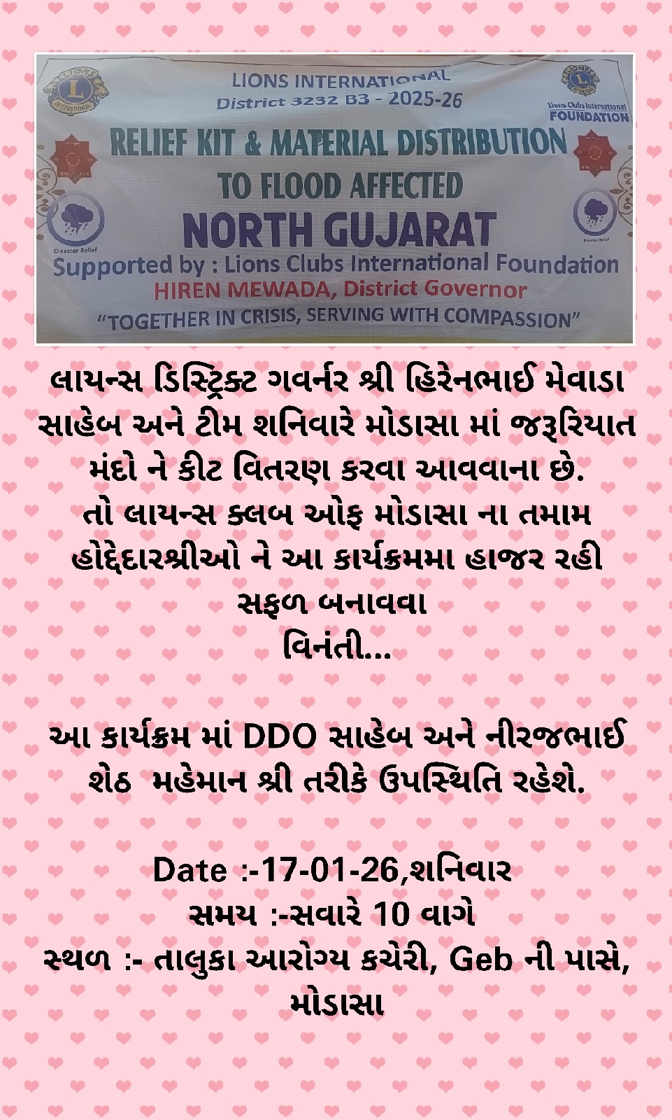લાયન્સ ડિસ્ટ્રિક્ટ ગવર્નર શ્રી હિરેનભાઈ મેવાડા સાહેબ અને ટીમ શનિવારે મોડાસા માં જરૂરિયાત મંદો ને કીટ વિતરણ કરવા આવવાના છે. તો લાયન્સ ક્લબ ઓફ મોડાસા ના તમામ હોદ્દેદારશ્રીઓ ને આ કાર્યક્રમમા હાજર રહી સફળ બનાવવા વિનંતી... આ કાર્યક્રમ માં DDO સાહેબ અને નીરજભાઈ શેઠ મહેમાન શ્રી તરીકે ઉપસ્થિતિ રહેશે. Date :-17-01-26,શનિવાર સમય :-સવારે 10 વાગે સ્થળ :- તાલુકા આરોગ્ય કચેરી, Geb ની પાસે, મોડાસા