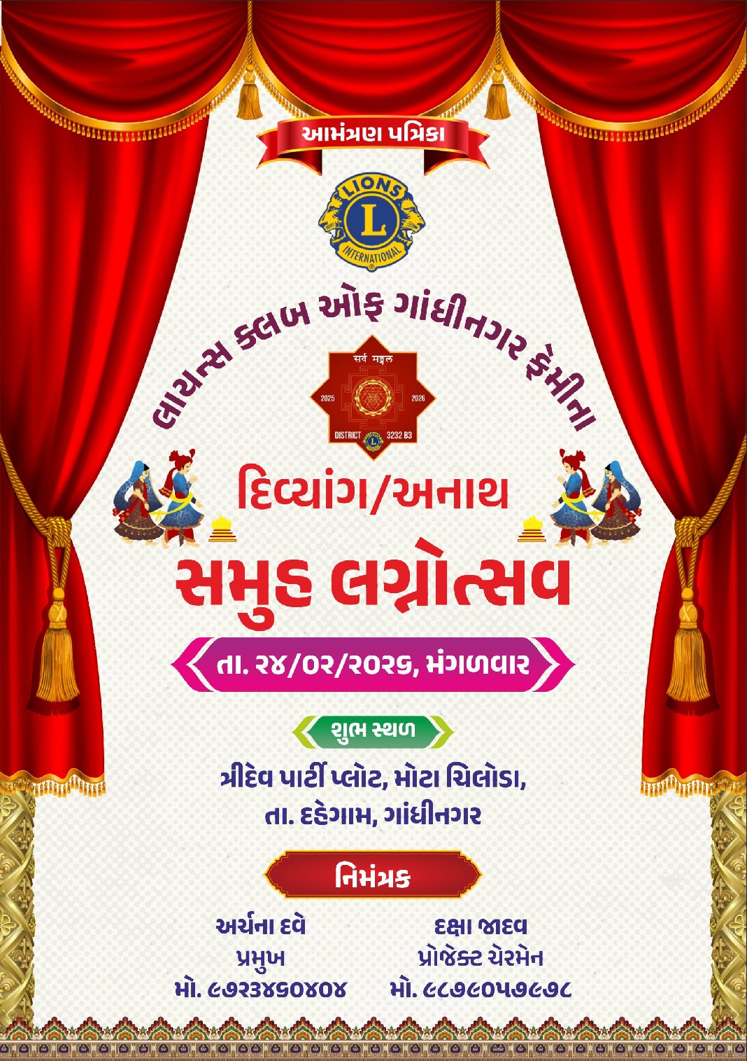 Divyang/Anaath Samuh Lagnotsav 2026 Our signature service project, Divyang/Anaath Samuh Lagnotsav, will be held on 24th February 2026 at Tridev Party Plot, Mota Chiloda. This year, 9 couples — including differently-abled and orphan beneficiaries — will begin their new journey of life with dignity, love, and blessings. This noble initiative is a matter of pride for our club. Every member is enthusiastically contributing to make this wedding ceremony a grand celebration and a successful service event. Together, we are not just organizing a wedding… we are building futures and spreading happiness. 💛
