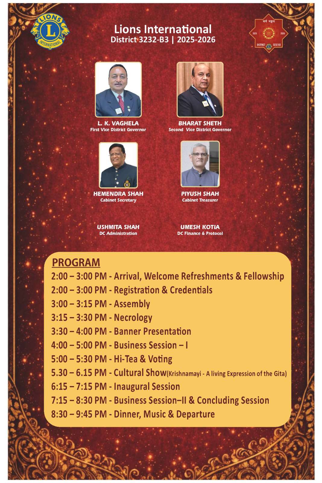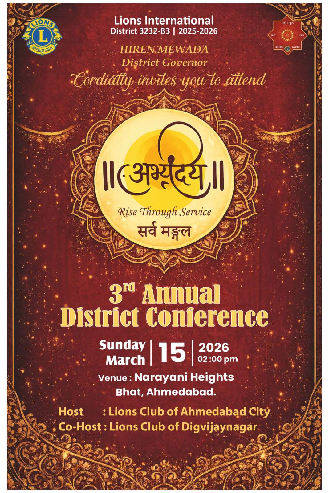 Invitation For 3232B3 Lions Officers & Friends, With immense pleasure, we extend the formal invitation for the 3rd Annual District Conference – “अभ्युदय : Rise Through Service” of Lions International District 3232-B3. This Conference is a wonderful and inspiring celebration of the service, leadership, fellowship, and collective achievements of the Lionistic year, guided by the noble spirit of “सर्व मङ्गल”. 🎭 “अभ्युदय Cultural Show” “Krishnamayi — A Living Expression of the Gita” ⏰ 5:30 PM – 6:15 PM 📅 Date : 15 March 2026 📍 Venue : Narayani Heights, Ahmedabad 🕑 Arrival & Fellowship : 2:00 PM 🕒 Conference Session : 3:00 PM – 8:30 PM 🍵 Hi Tea : 5:00 PM – 5:30 PM 🍽 Dinner & Entertainment : After the Conference Your gracious presence along with your spouse will add great warmth and dignity to this special occasion. I personally will be highly obliged by your Gracious Presence. Sarva Mangal Greetings, 🦁 Lion Hiren & Gita Mewada *सर्व मङ्गल