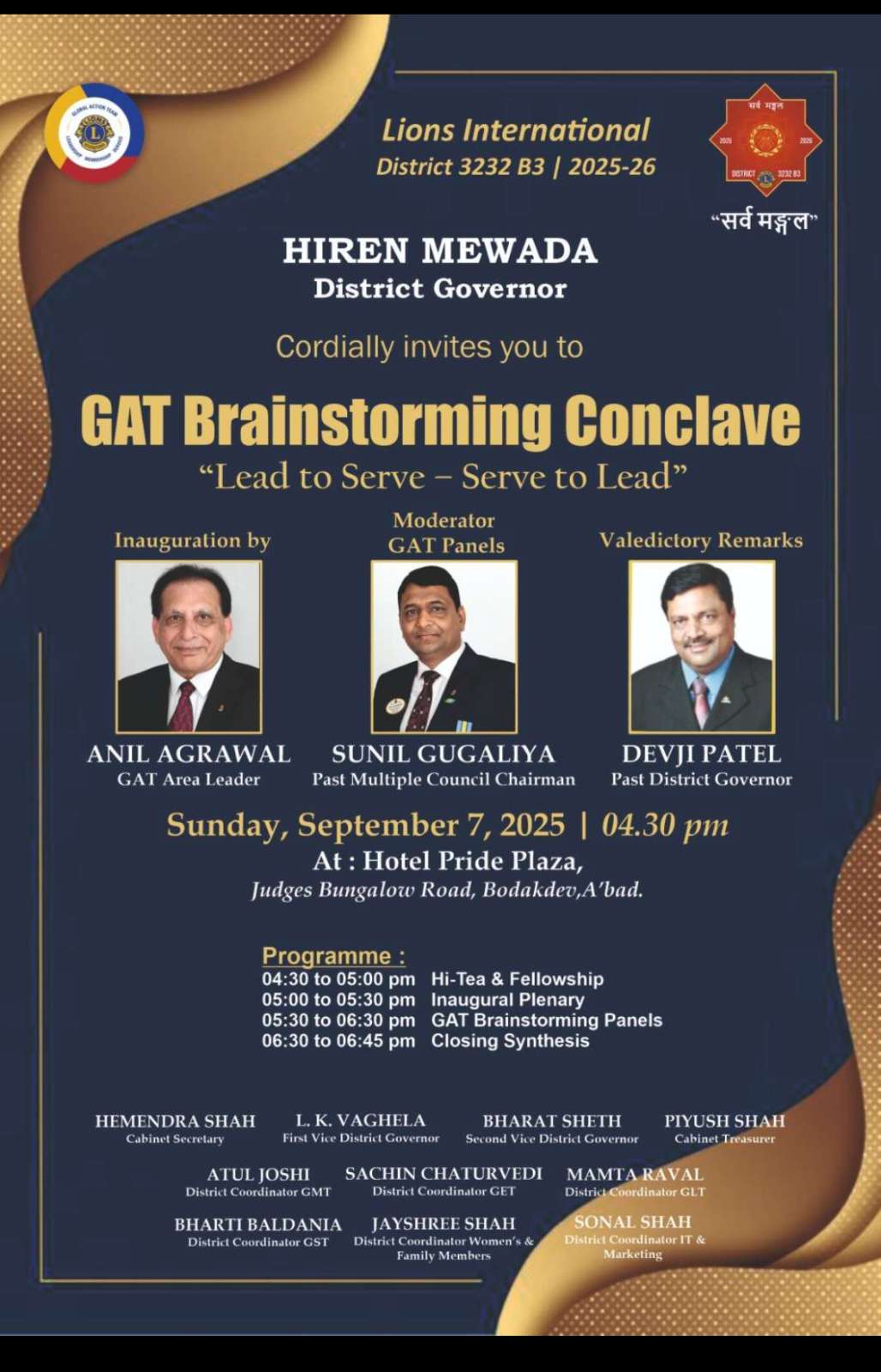 Seven members from Lions Club of Ahmedabad Vibrant actively participated in the GAT Brainstorming Conclave organized by District 3232 B3 under the leadership of District Governor Lion Hiren Mewada. The conclave, themed “Lead to Serve – Serve to Lead”, featured enlightening sessions by distinguished leaders — Lion Anil Agrawal (GAT Area Leader), Lion Sunil Gugaliya (Past Multiple Council Chairman), and Lion Devji Patel (Past District Governor). The event provided valuable insights on leadership, teamwork, and the Global Action Team’s (GAT) strategic initiatives for effective service delivery. The program fostered collaboration and inspired participants to strengthen the Lions movement with renewed enthusiasm and leadership spirit. Lion CA Pankaj Jain Secretary, Lions Club of Ahmedabad Vibrant